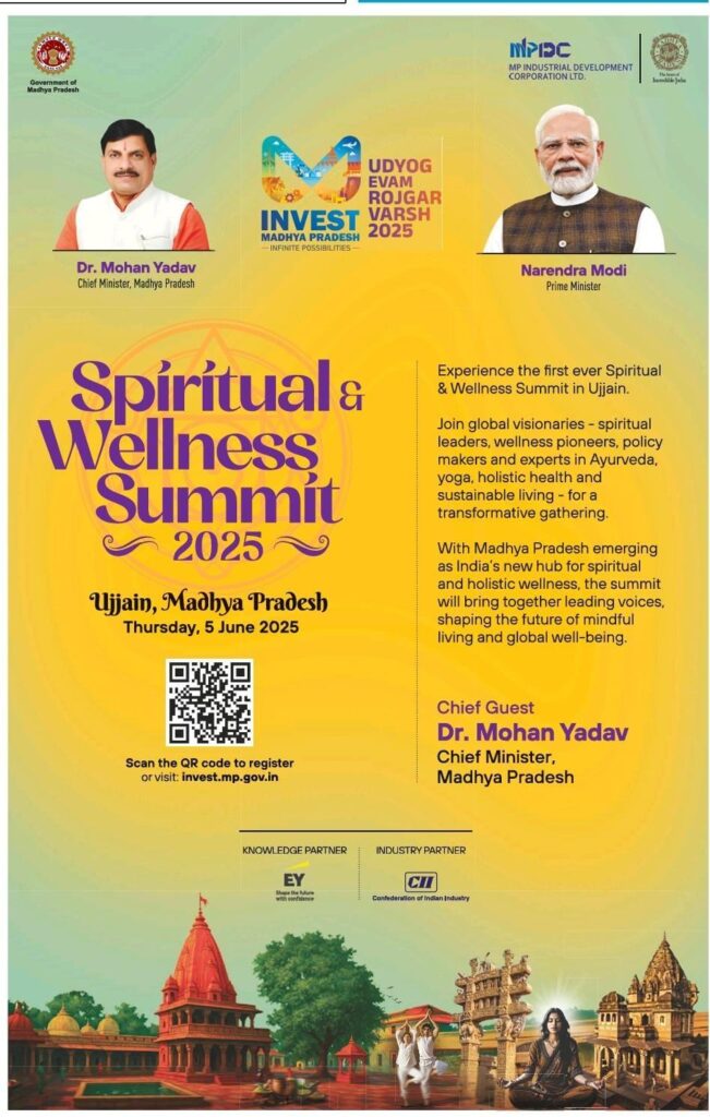Bhopal, Madhya Pradesh, June 4, 2025 – On June 5, 2025, the sacred city of Ujjain will host the Spiritual and Wellness Summit, a landmark event aimed at establishing Madhya Pradesh as a global hub for wellness and elevating Ujjain as a premier destination for holistic health. Organized by the Department of Industrial Policy and Investment Promotion under the esteemed presence of Chief Minister Dr. Mohan Yadav, the summit will spotlight yoga, Ayurveda, naturopathy, spiritual practices, and wellness-driven industries, fostering public awareness, investment, and international collaboration.